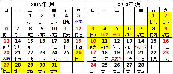 放假時間:2019年1月26日(農歷臘月二十一)-2019年2月11日(農歷正月初七) 共17天。節后2019年2月12號(農歷正月初八)全體員工正式上班。